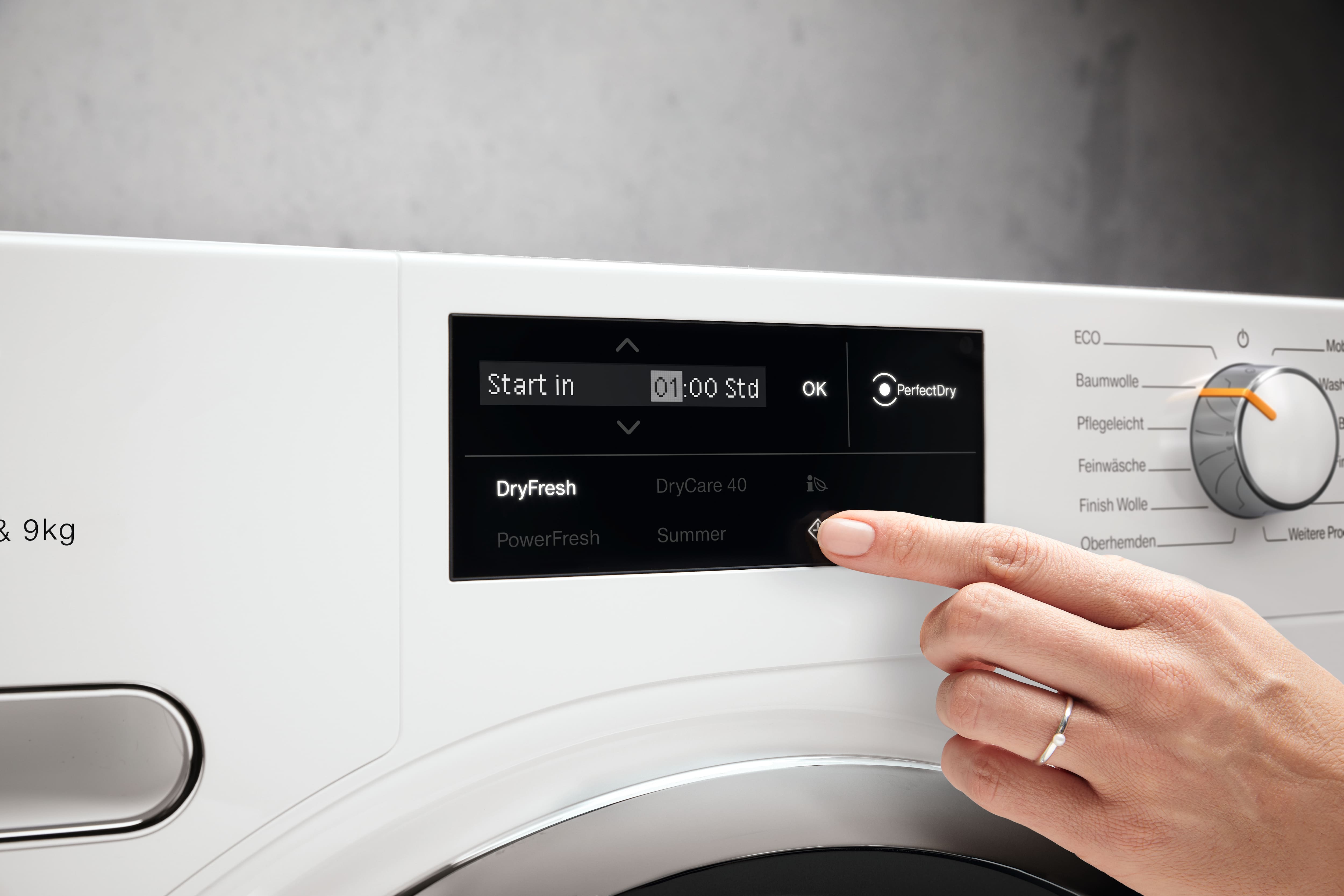 Използвайте новите опции с DryCare 40 и сушете всички артикули, които могат да се перат на 40 °C.* - EcoSpeed ефективно намалява времето за сушене с 20 минути*В сравнение със сушилни Miele без EcoSpeed със същия капацитет на зареждане и подобна енергийна ефективност. Тествани с програмата “Памук” с пълно зареждане.